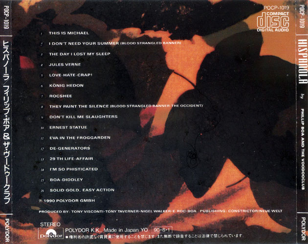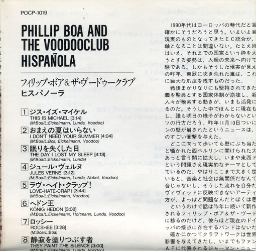 ヒスパノーラ / Hispañola - フィリップ・ボア&ザ・ヴードゥークラブ / Phillip Boa & The Voodooclub English full translation「不思議の世界のサウンドトラック ヨーロッパ・ロック・シーンをリードするフィリップ・ボアのめくるめくカラフル・ポップ・ワールド。 日本盤のみT・レックスのカヴァー曲を追加収録。」 "The sound track of a wonder world The dazzling colorful pop world of Phillip Boa who leads European rock scene. Only the Japan CD includes the added cover song of T. Rex." 発売: ポリドール株式会社・1990年 Polydor Records 1990 税込定価¥2,800 (税抜価格¥2,718) 2,800 yen with tax (2,718 yen without tax) |